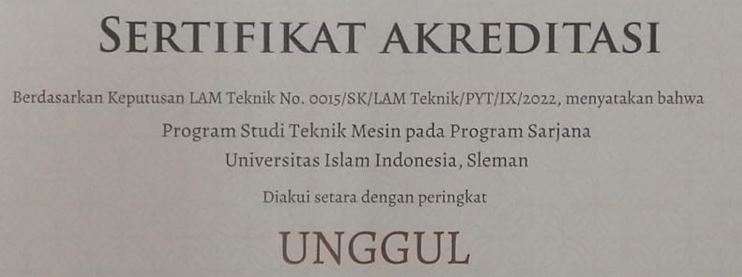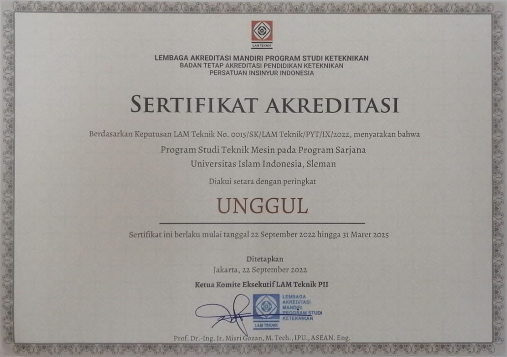 Akreditasi Institusi Unggul. Program Studi Teknik Mesin Universitas Islam Indonesia telah mendapatkan Akreditasi Unggul dari LAM-Teknik dan Akreditasi Internasional dari IABEE.