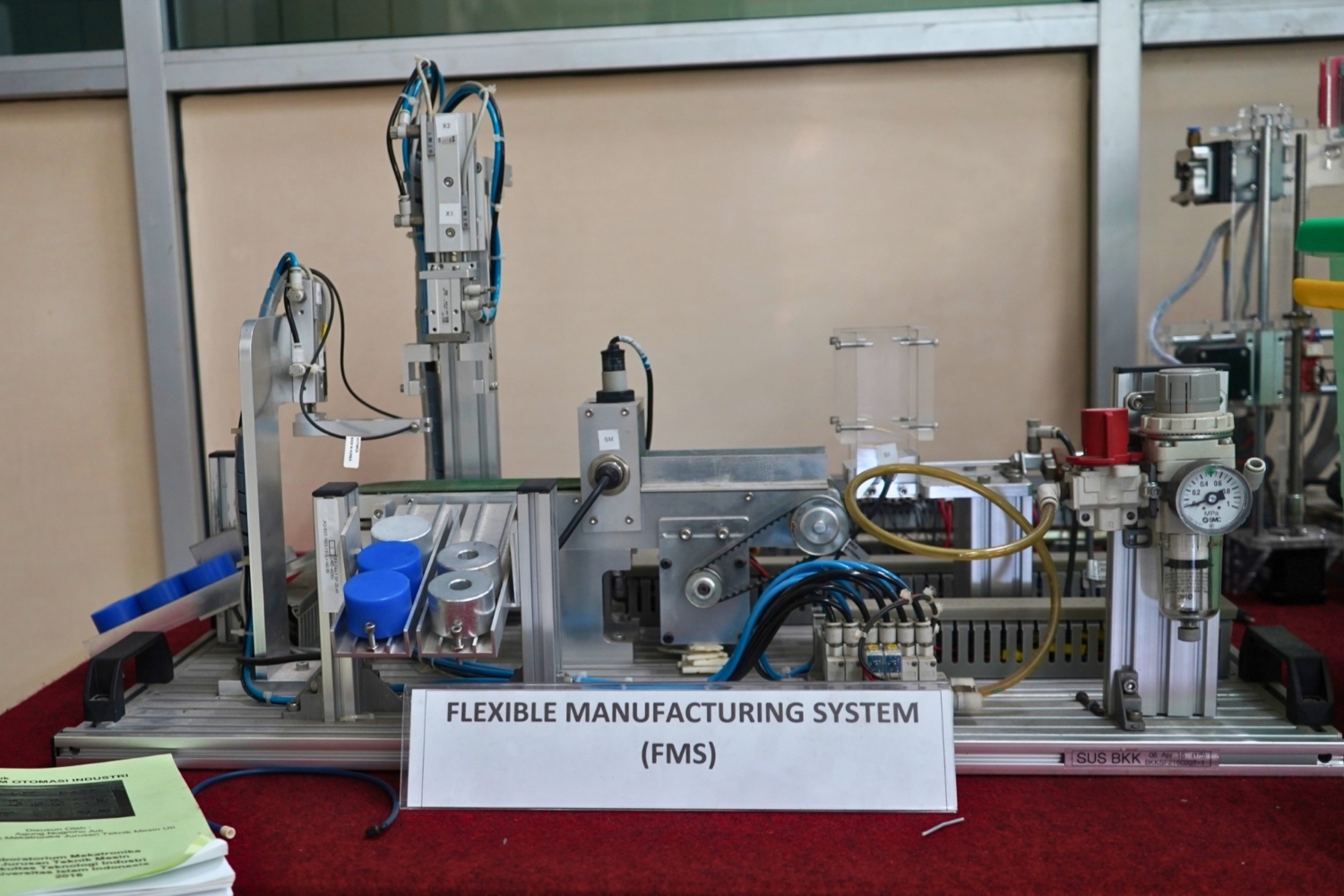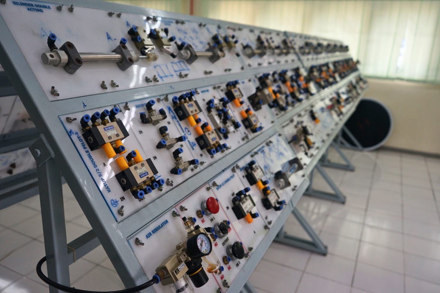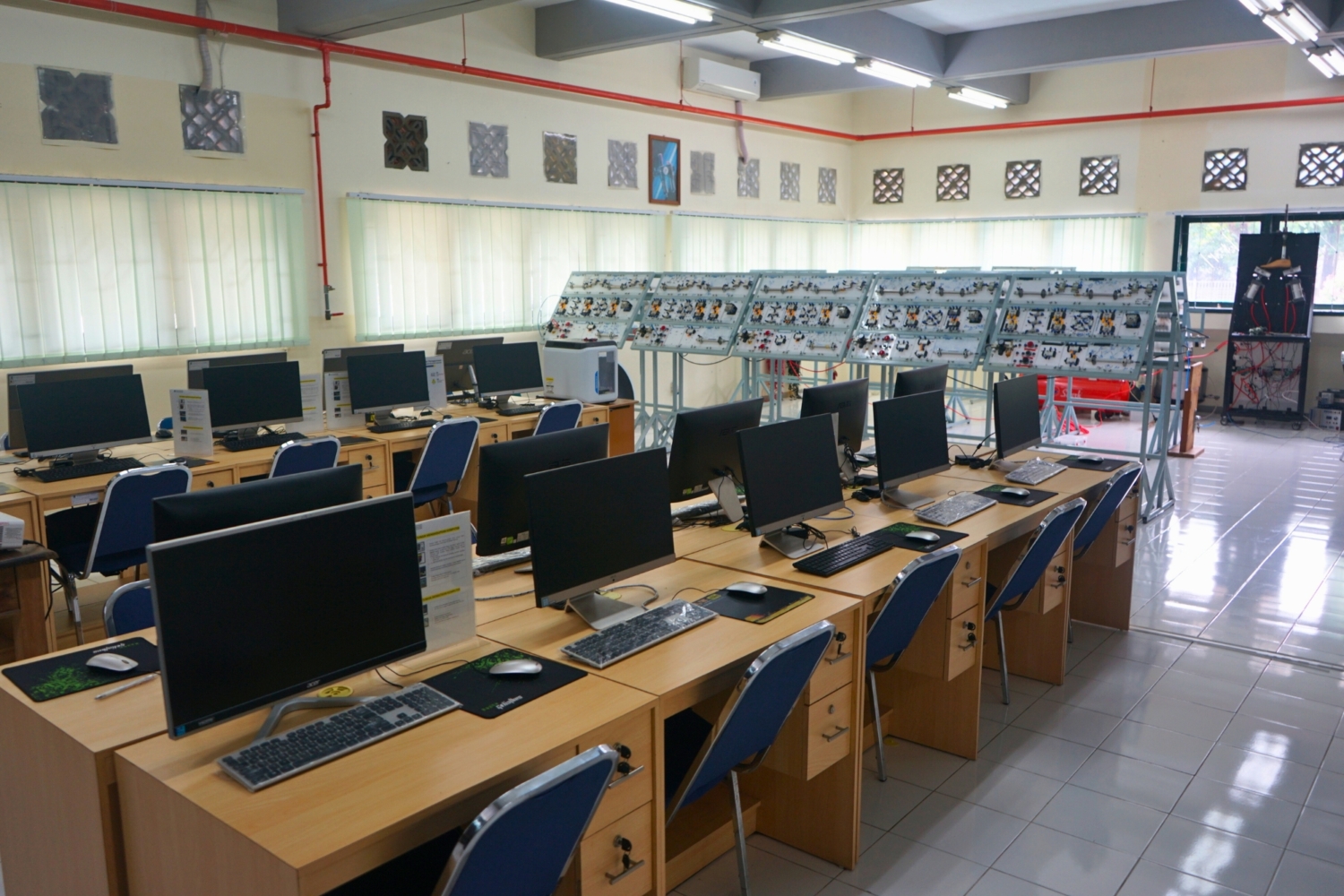 Laboratorium Mekatronika berfokus pada pengintegrasian teknik mesin, elektronika, dan teknologi komputer dalam desain dan pengembangan produk. Laboratorium ini dilengkapi dengan peralatan pneumatik, elektro-pneumatik, dan PLC (Programmable Logic Controller) untuk menunjang kegiatan praktikum dan penelitian tugas akhir. Selain itu, tersedia komputer berspesifikasi tinggi untuk kebutuhan pemodelan, simulasi sistem pneumatik, dan pemrograman PLC, sehingga mahasiswa dapat memahami aplikasi sistem mekatronika secara komprehensif.