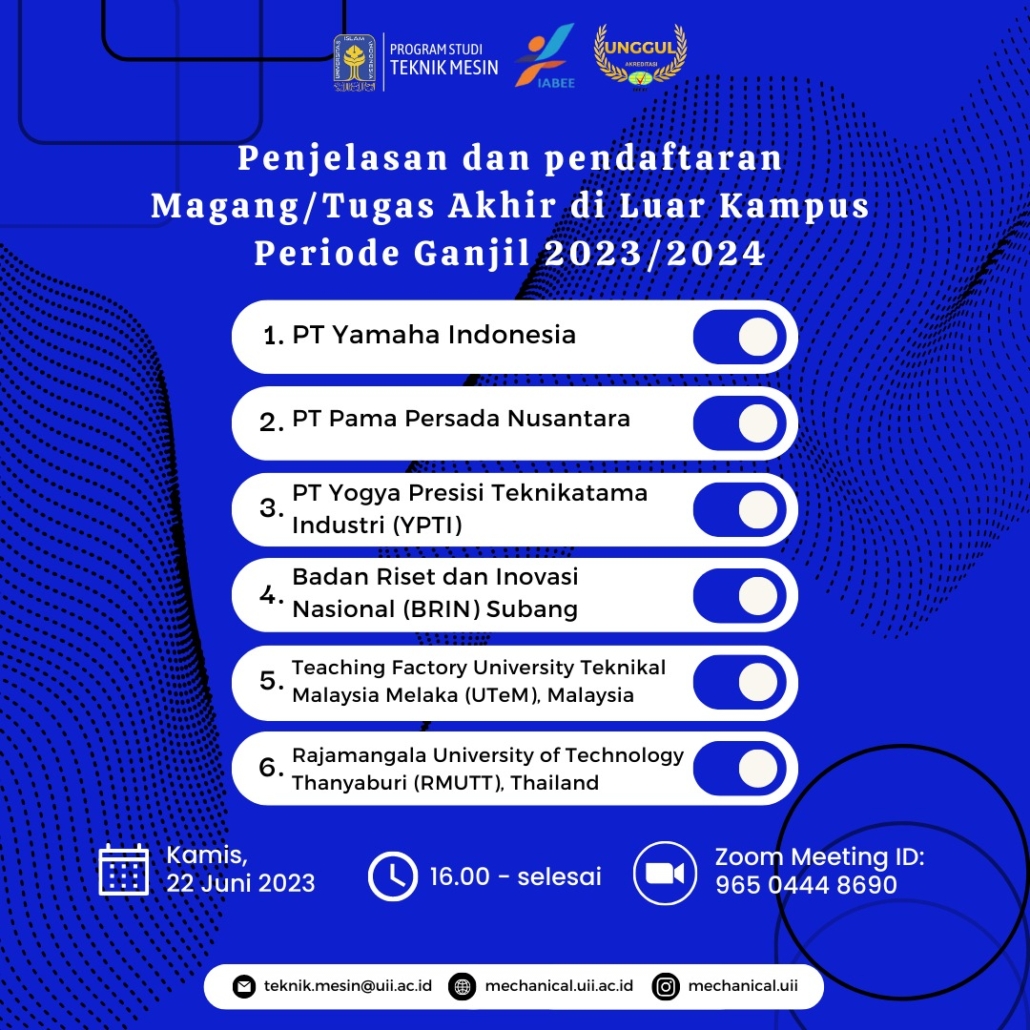 Apakah kamu berencana magang di semester depan? Yuk, ikut acara penjelasan dan pendaftaran Magang/Tugas Akhir di Luar Kampus. InsyaAllah akan dilaksanakan pada: