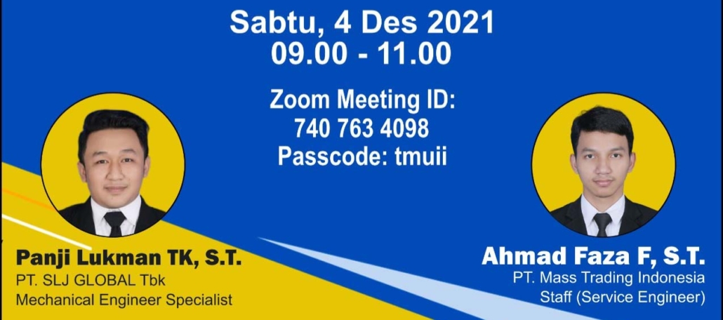 Acara ini akan dilaksanakan secara online dengan aplikasi Zoom dengan ID: 740 763 4098 – pass code: tmuii, pada jam 09:00 hingga 11:00 WIB.. So, bagi temen-temen sobat mesin pastikan ikuti acara ini, kita akan belajar banyak dari kedua pembicara keren ini.