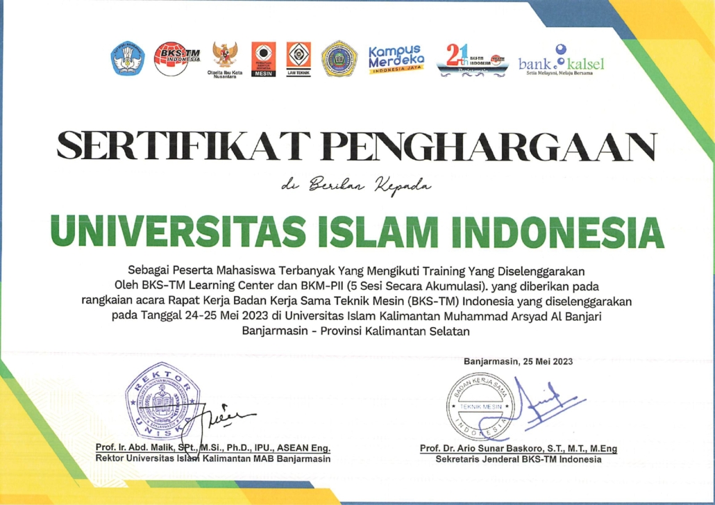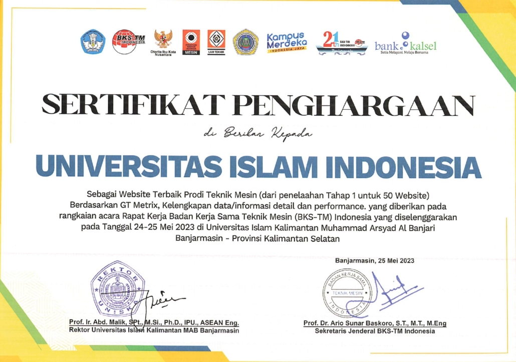 Pada acara rapat kerja tersebut, BKS-TM memberikan penghargaan yang terbagi dalam 4 kategori penghargaan. Alhamdulilllah, Teknik Mesin UII berhasil memboyong 3 penghargaan dari 4 kategori yang ada, yaitu peringkat 2 website terbaik, peringkat 9 publikasi terbanyak dalam Jurnal Teknik Mesin Indonesia (JTMI), dan peringkat 7 jumlah peserta mahasiswa dalam training BKS-TM. Penghargaan diserahkan oleh Sekjend BKS-TM Prof. Ario Sunar Baskoro kepada kaprodi Teknik Mesin UII, Dr. Muhammad Khafidh.